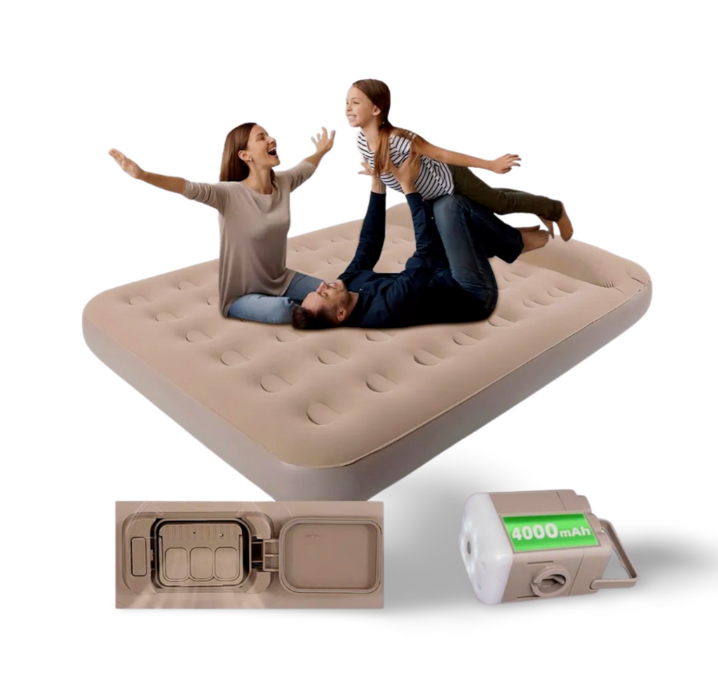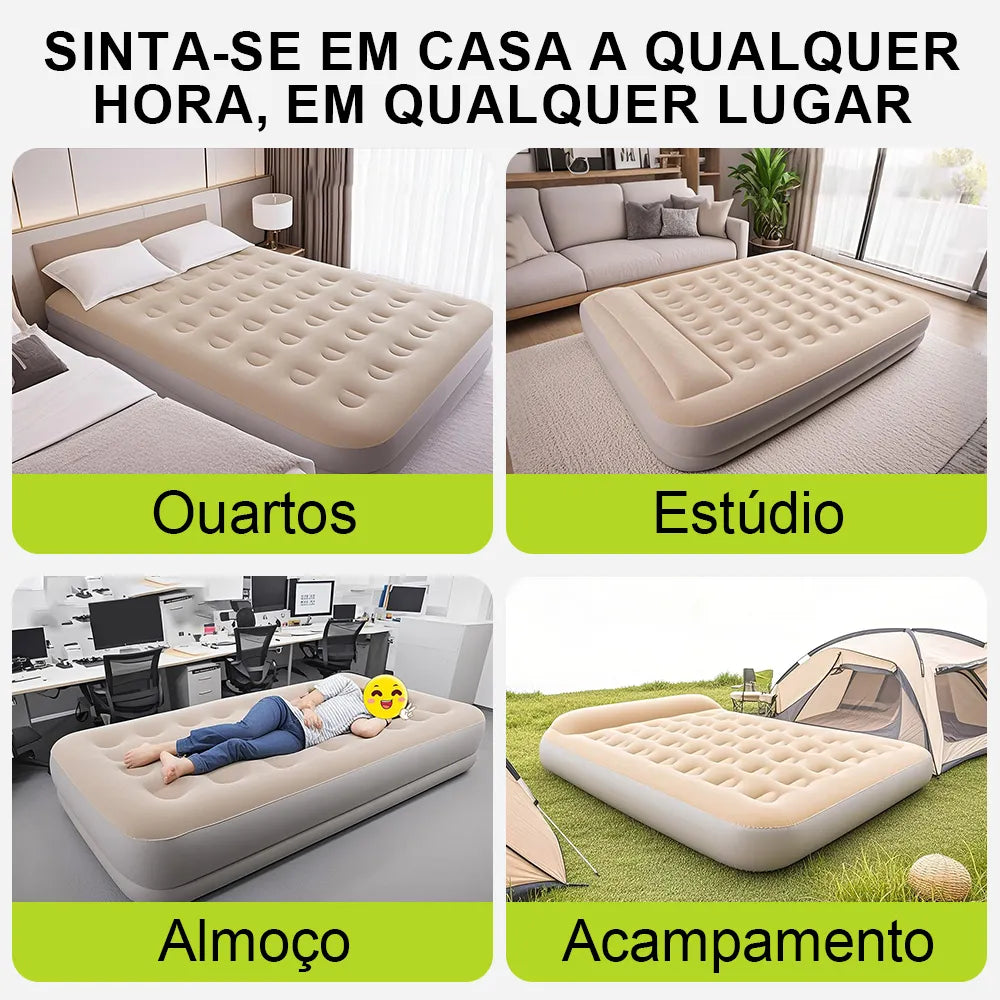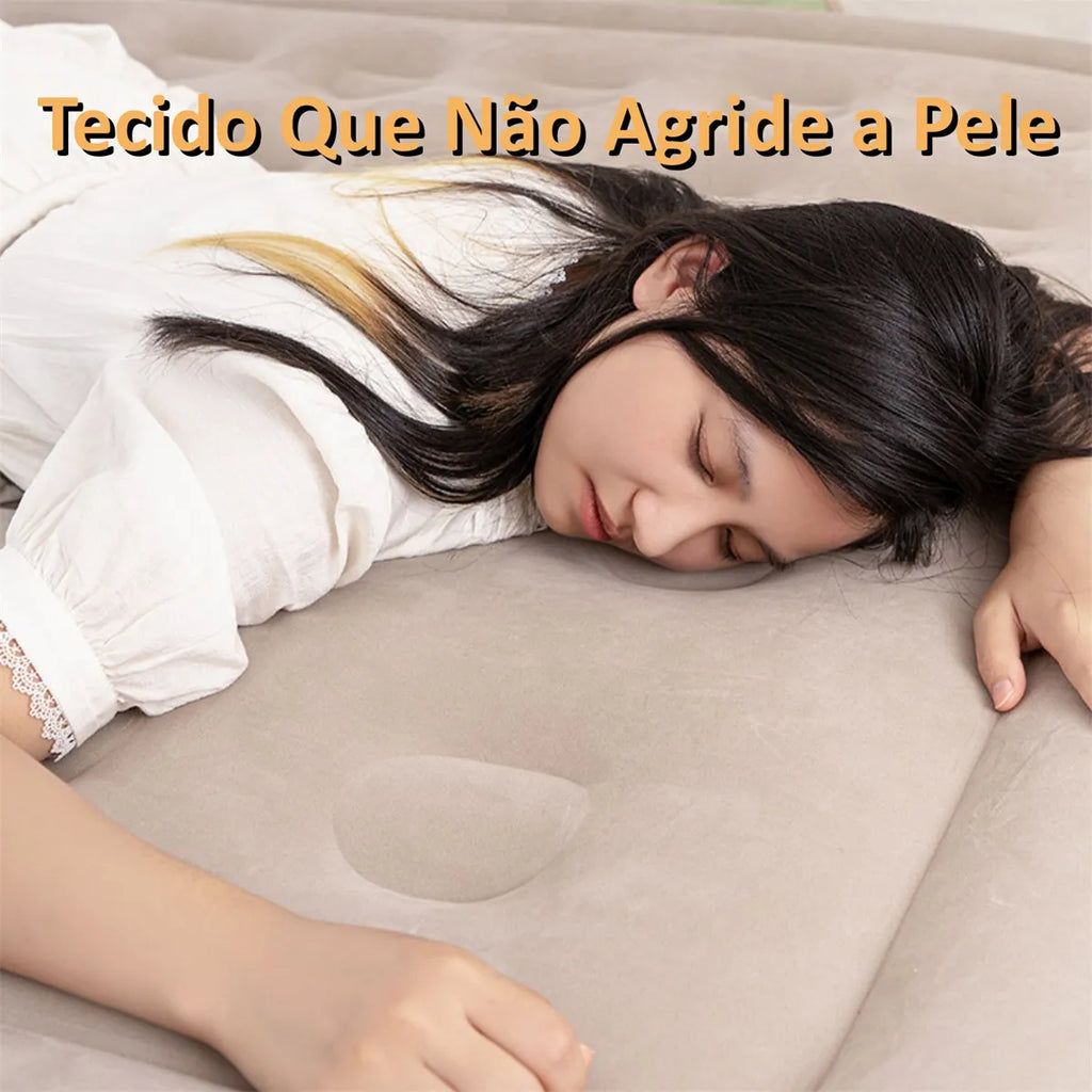 O Colchão Inflável Queen (200×150×28 cm) reúne inflagem automática em ~3 minutos e um design ergonômico com pillow top e travesseiro integrado, garantindo apoio cervical e sono profundo.