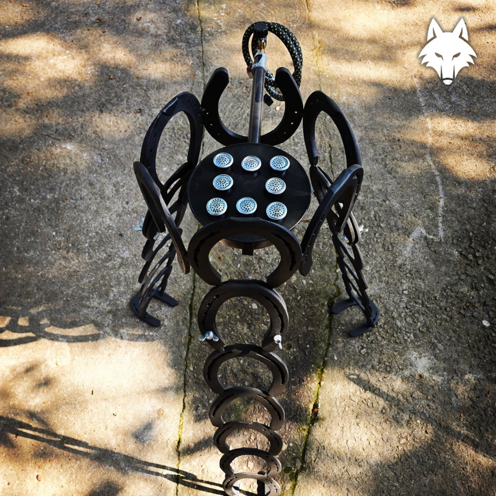 • Design campeiro autêntico: escultura funcional feita com ferraduras, presença forte na área externa.