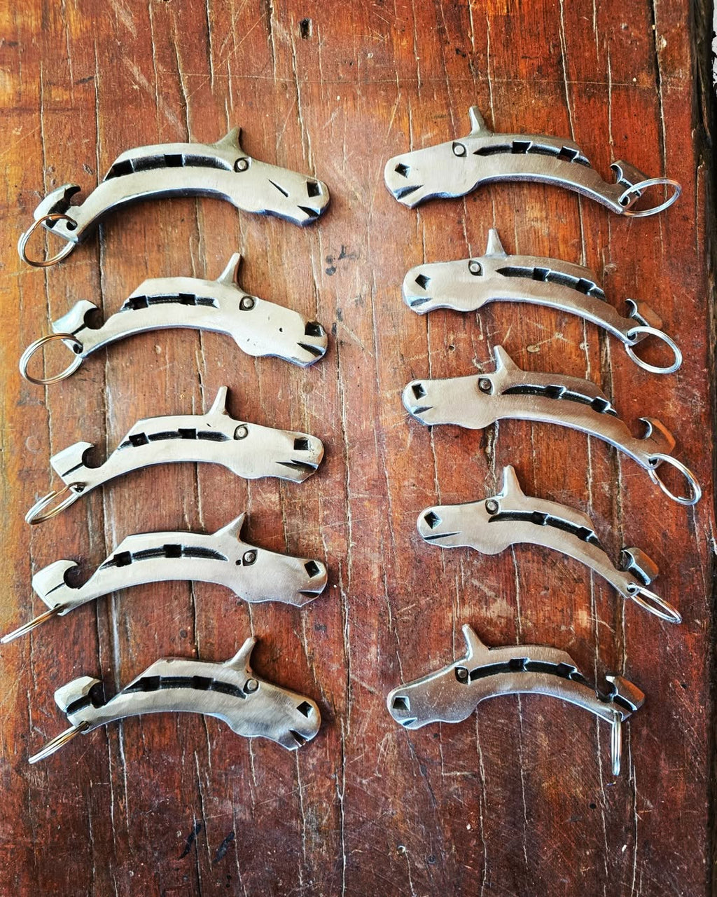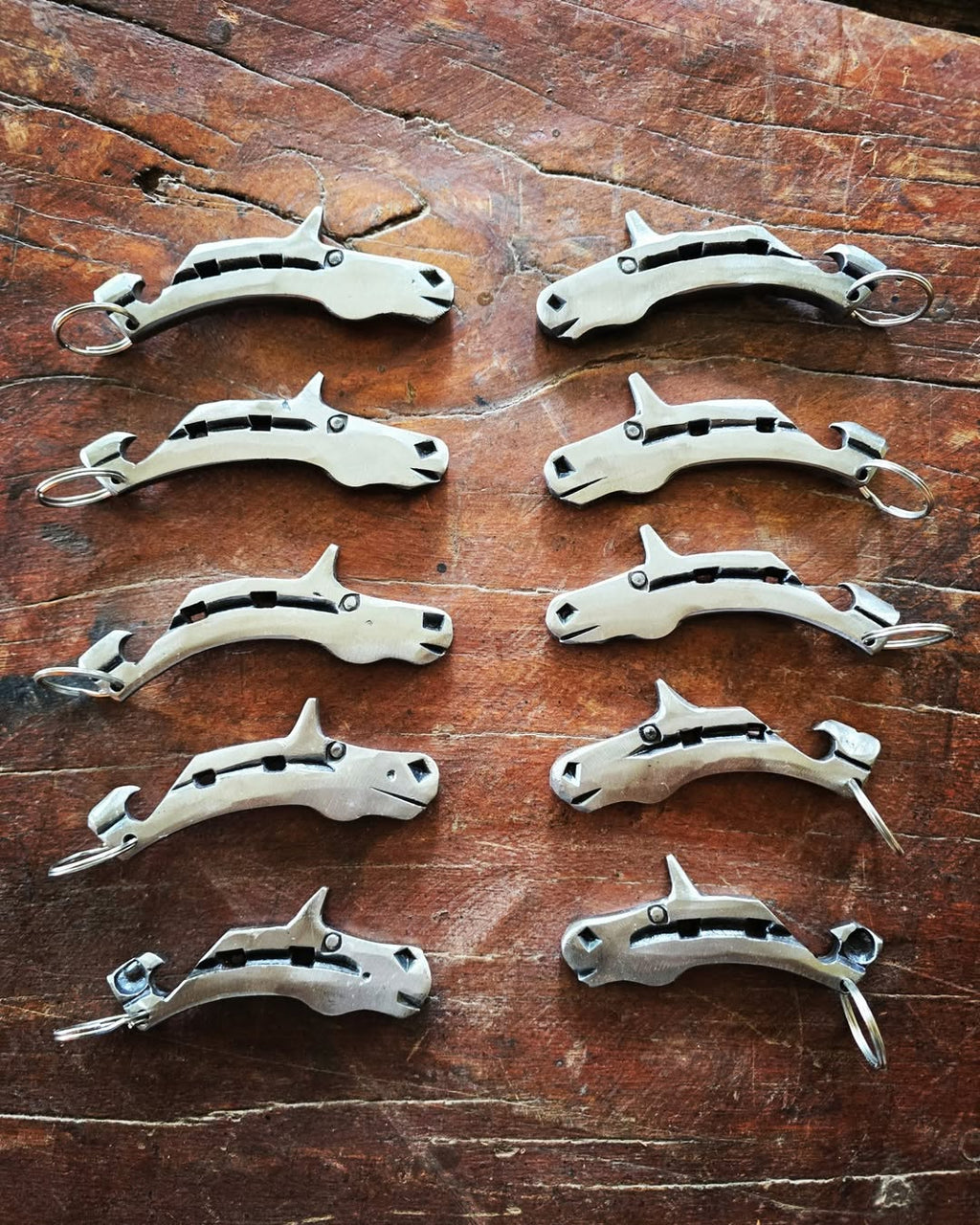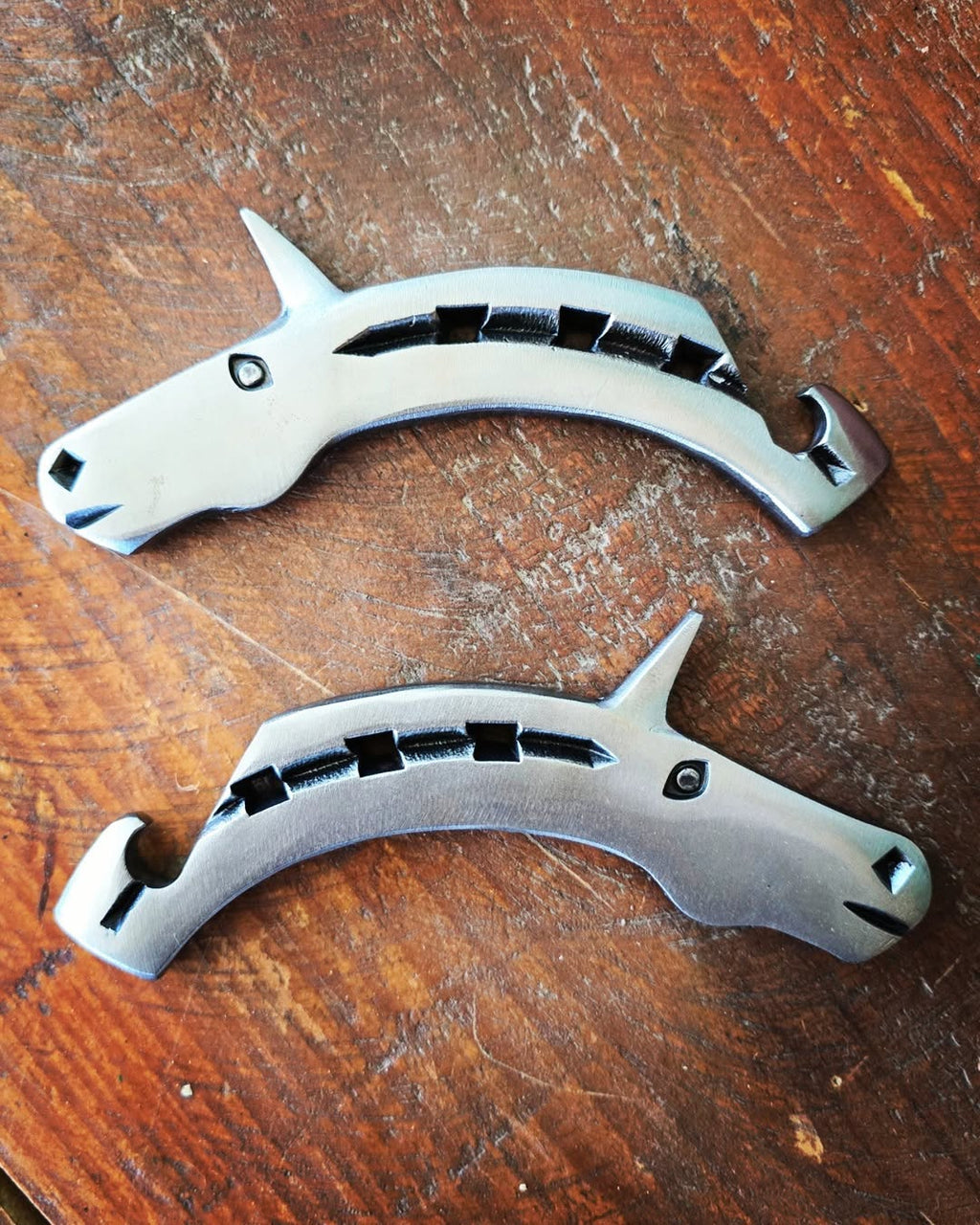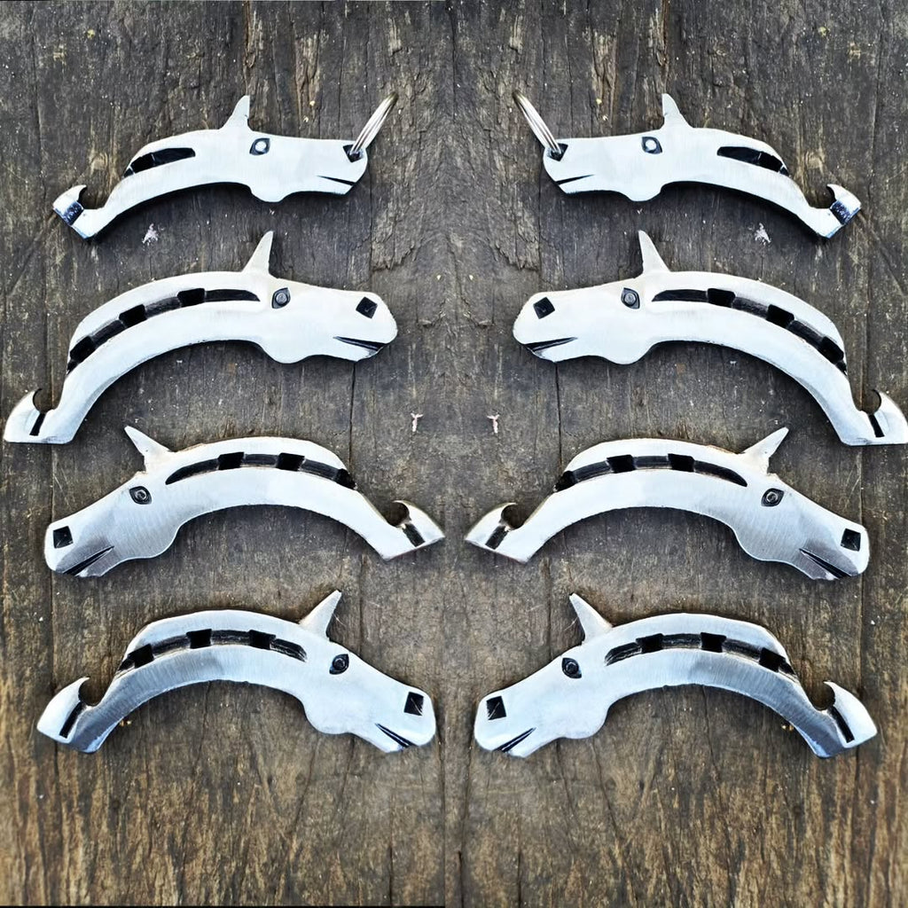 Peça de bolso, robusta e com alma de oficina. Abridor de garrafas em aço, modelado no formato de cavalo. O corpo curvo oferece mais alavanca (abre em 1 movimento) e o furo traseiro permite usar como chaveiro ou pendurar na área do churrasco. Produção artesanal brasileira.