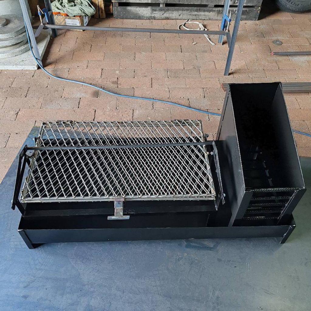 O grande diferencial é o tambor lateral (braseiro): você prepara a brasa separadamente e vai puxando para baixo da grelha na medida certa, com muito mais segurança e controle de temperatura.